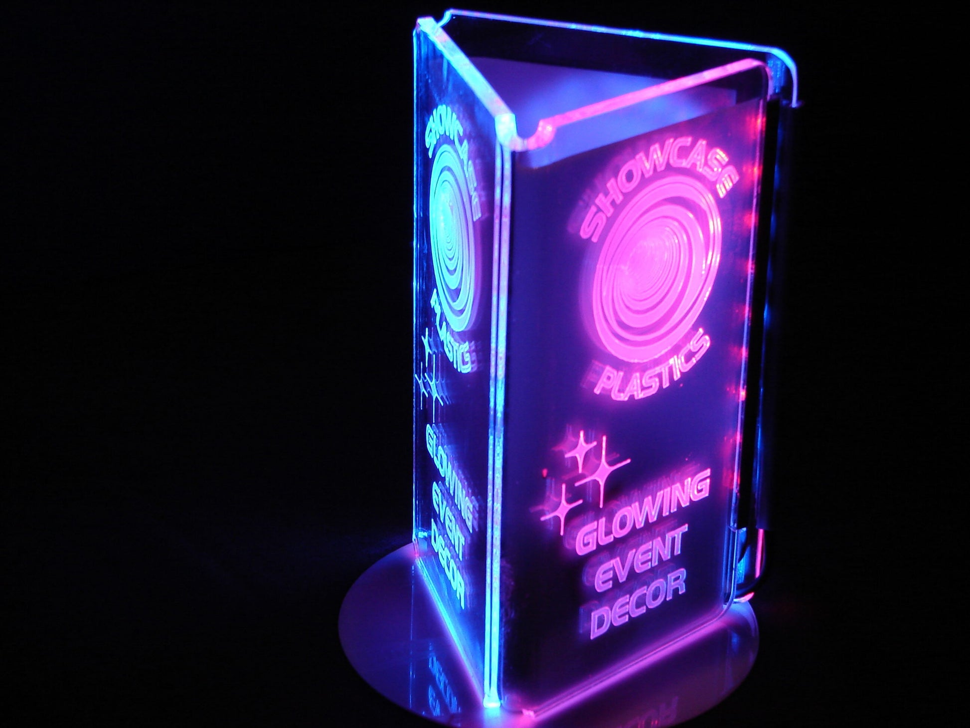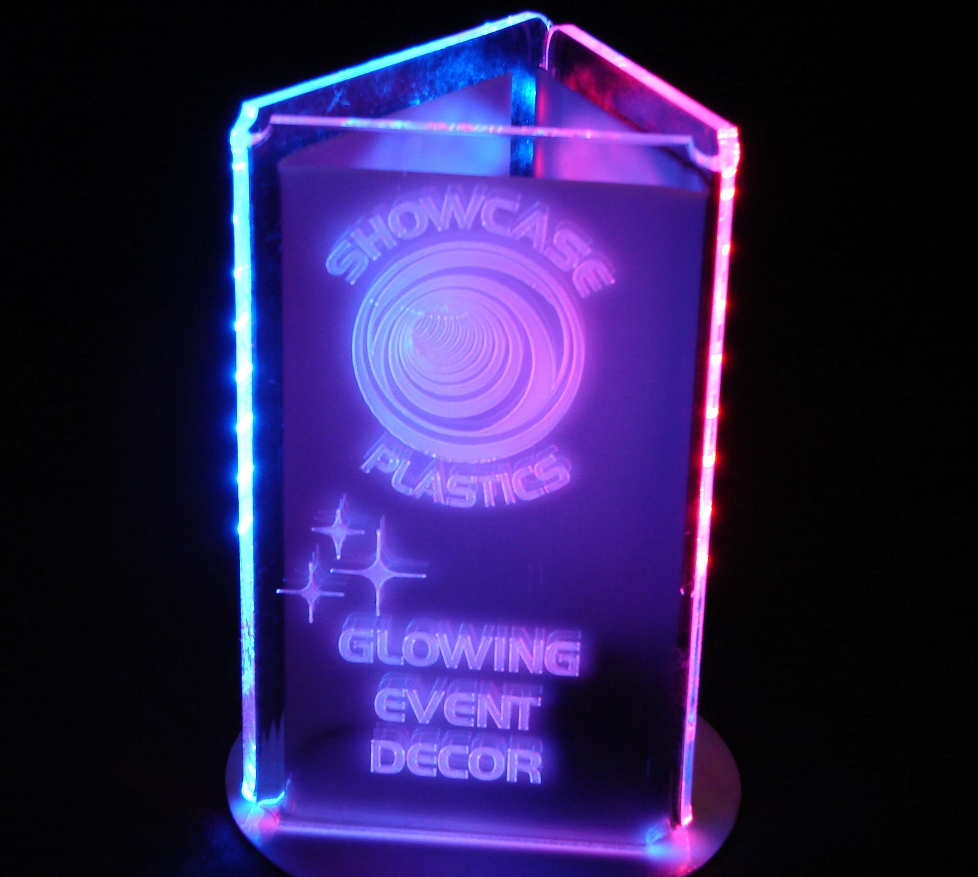 Our unique 3 sided centerpiece-Engrave each side the same or 3 different messages. Has a white insert so images don't interfere with each other. 1 or 2 colors. The 2 colors merge on the center panel for a beautiful pastel blend.