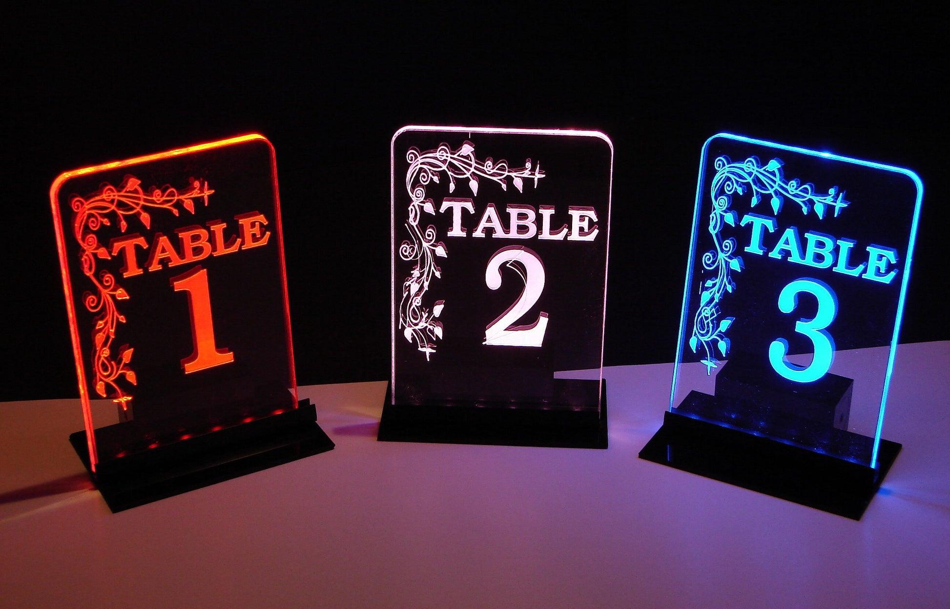 These table numbers operate on a 9V battery that lasts for days and come in a variety of LED colors: white, warm white, light pink, bright pink, red, blue, ice blue, green, violet.